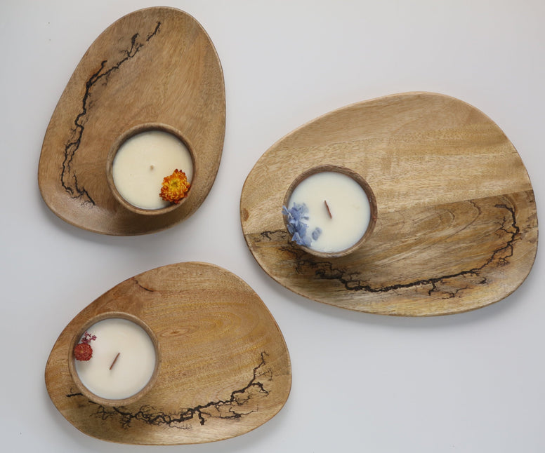 Discover the art of sustainable luxury with the Repurposed Mango Wood Platter and Candle Collection.